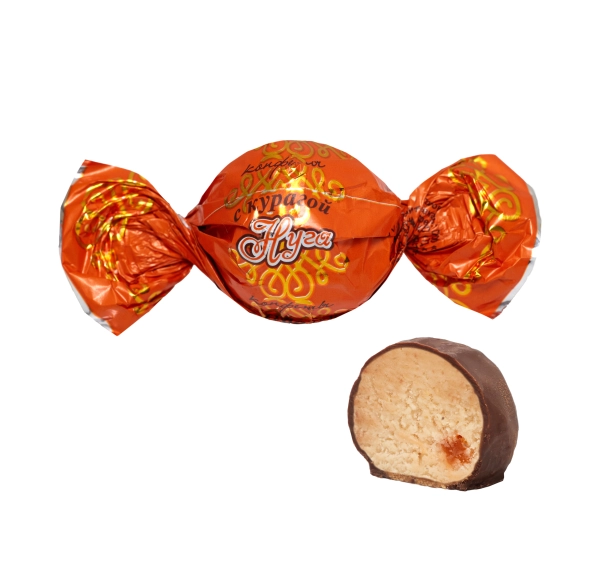 Состав: сахар, патока, глазурь, масло кокосовое, курага, белок яичный сухой, кислота лимонная, ароматизатор. В 100г продукта содержится: белков- 12,8г, жиров- 1,2г, углеводов -68г. Энергетическая ценность 100г продукта – 316 ккал/1320 кДж.