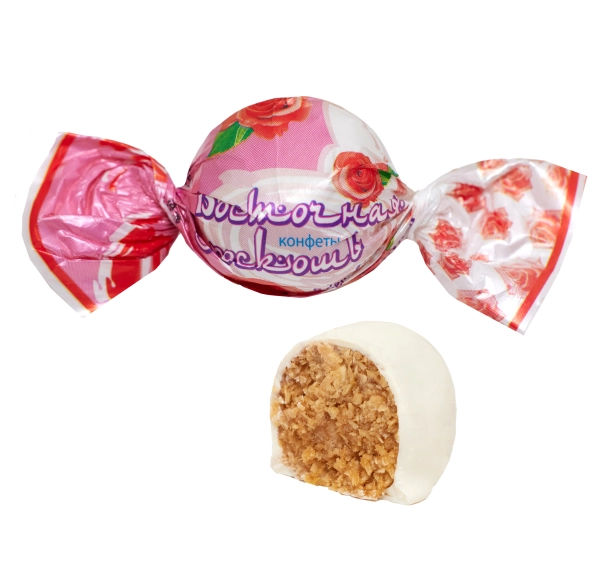 Состав: сахар, молоко сухое цельное, патока, глазурь белая (сахар, заменитель масла какао, сыворотка молочная сухая, лактоза, эмульгатор лецитин соевый, ароматизатор), стружка кокосовая, ароматизатор.