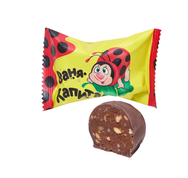 Состав: сахар, патока, глазурь (сахар, заменитель масла какао нетемперируемый лауринового типа (масло пальмоядровое рафинированное дезодорированное гидрогенизированное, эмульгаторы (Е492), (Е322)), какао-порошок, сыворотка молочная сухая, ароматизаторы, эмульгаторы (лецитин соевый (Е322), (Е476), молоко сгущенное вареное, масло кокосовое, ядро арахиса, ароматизатор. В 100г продукта содержится: белков-4,2г, жиров-7,5г, углеводов -81,8г. Энергетическая ценность 100г продукта - 1640 кДж/390 ккал.